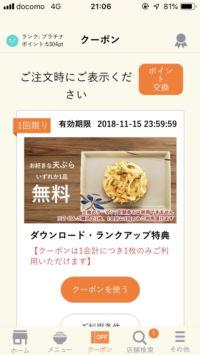 今回アプリポイントで「天ぷら1個無料」です。