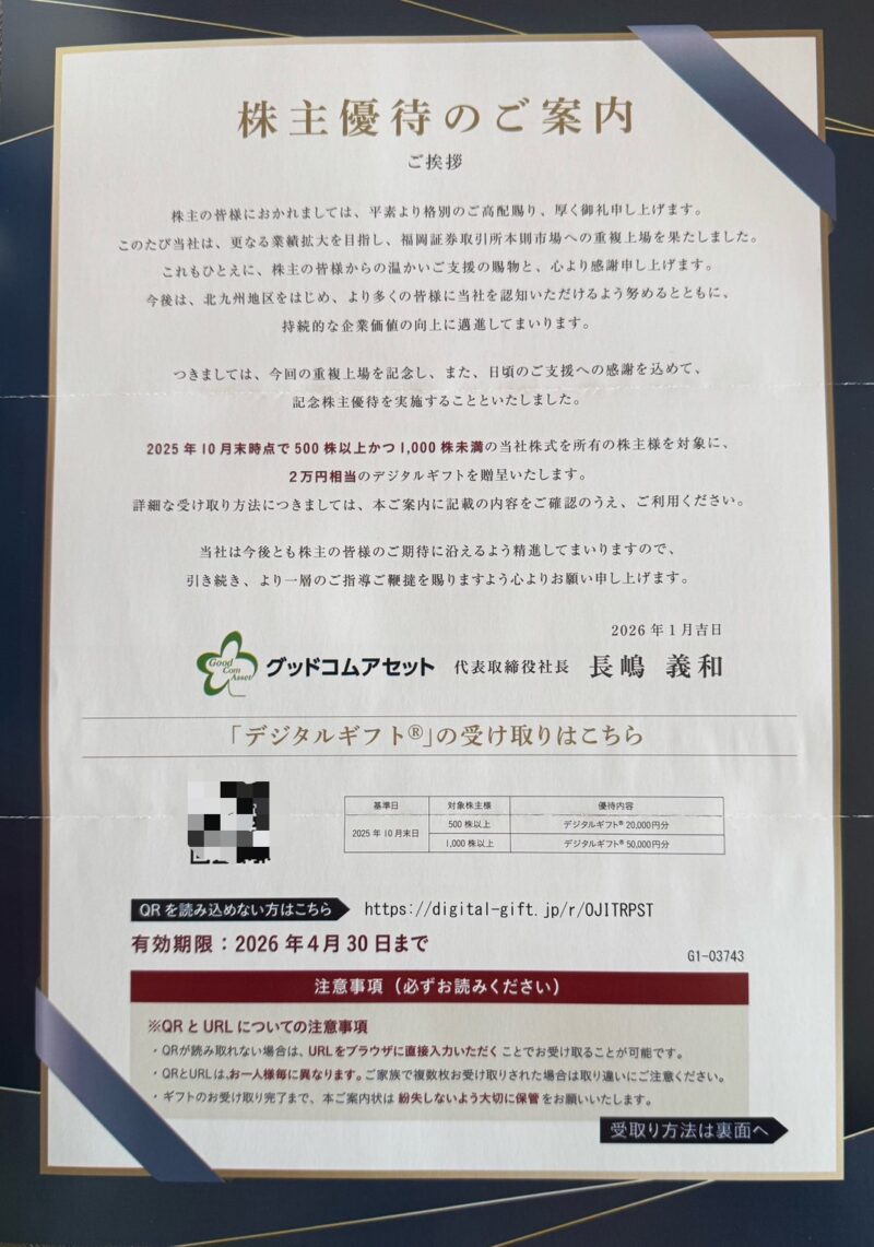 🎊✨【グッドコムアセット】記念株主優待✨500株でも2万円に感動💰